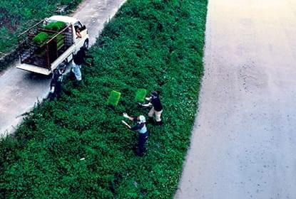 Début mai les semences sont répandues dans les germoirs où elles passeront un mois à couvert. Les plants de quelques centimètres sont prêts pour le repiquage en juin, une étape qui mobilise toute l’équipe. Relevés de données mensuelles, gestion de l’eau, pose de clôtures, création de rigoles pour homogénéiser l’eau dans les parcelles, taille des herbes sur le pourtour des rizières et surtout désherbage sont les activités quotidiennes des kurabitos agriculteurs.
